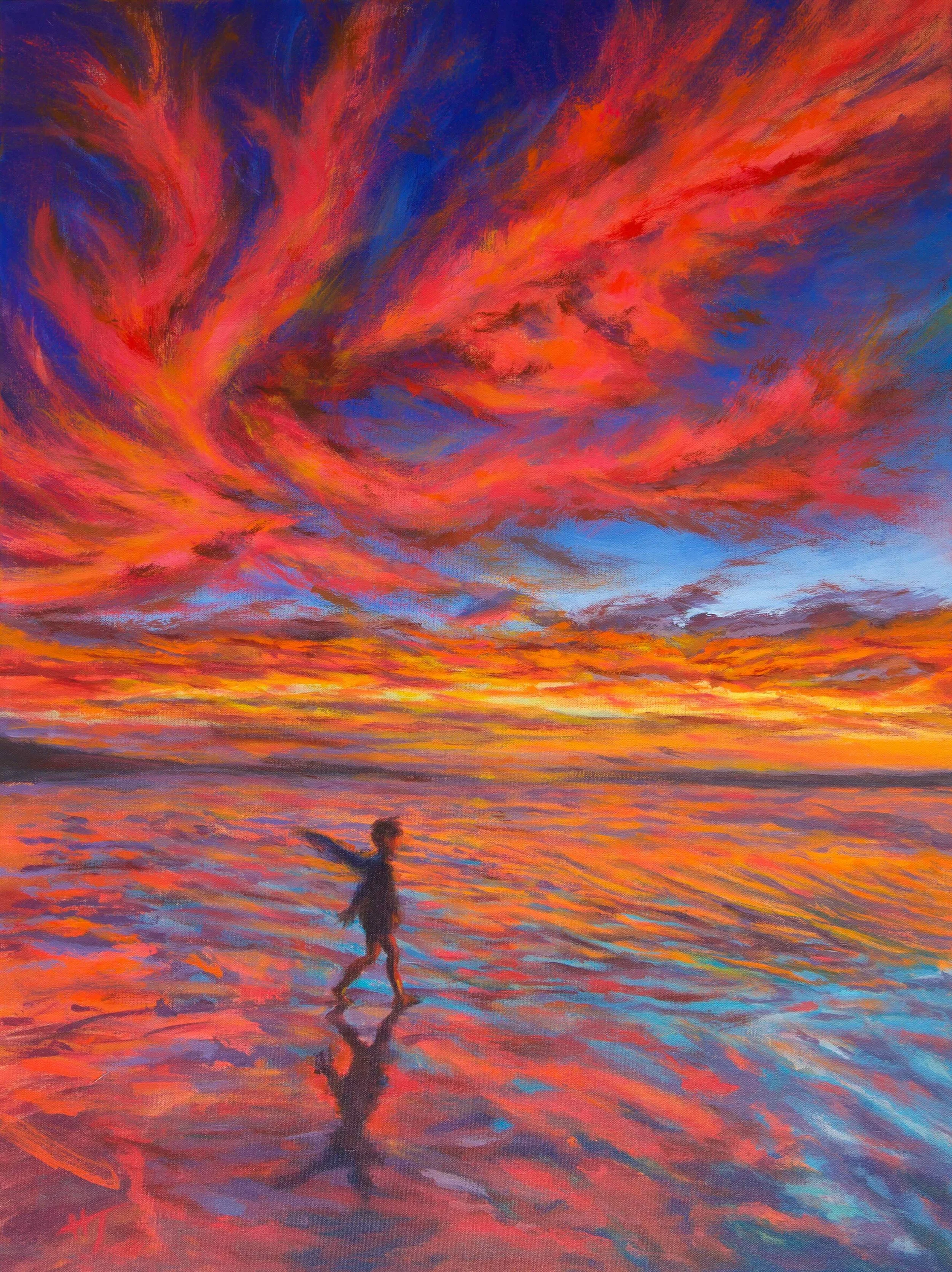 At some point, a young boy jumped into that canvas. Running around the beach against the backdrop of the beautiful sunset, he gestured and spoke. Sometimes he would tumble on the sand while playing, other times he would run towards the sea as if about to plunge into the burning red water. He chased a flock of birds in the crimson-colored sea at sunset. Against the backdrop of the ever-changing sunset light, cloud formations, and the shimmering light of the waves reflecting that light, the boy, becoming one with the scene and fully enjoying it all, left a strong impression on me.